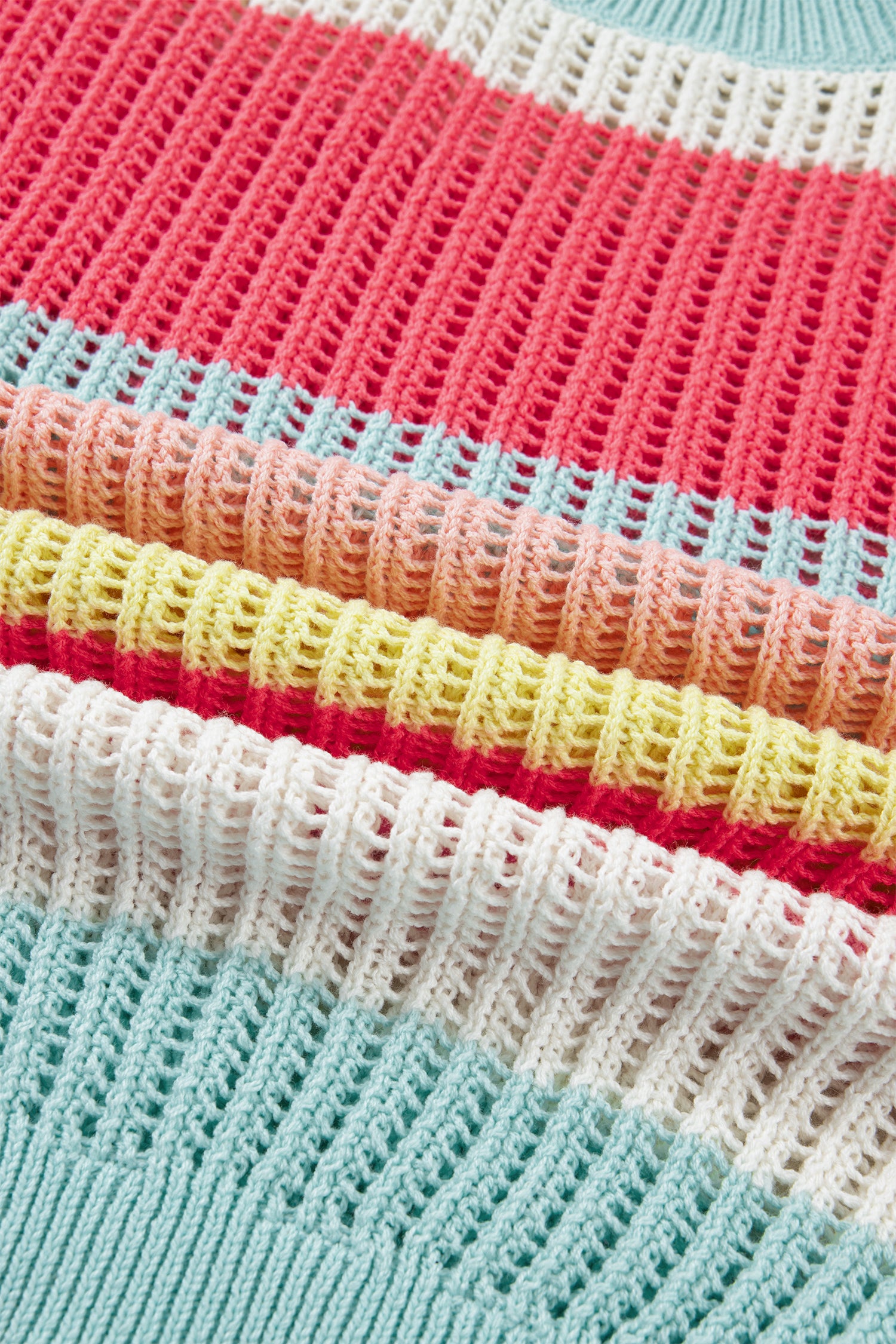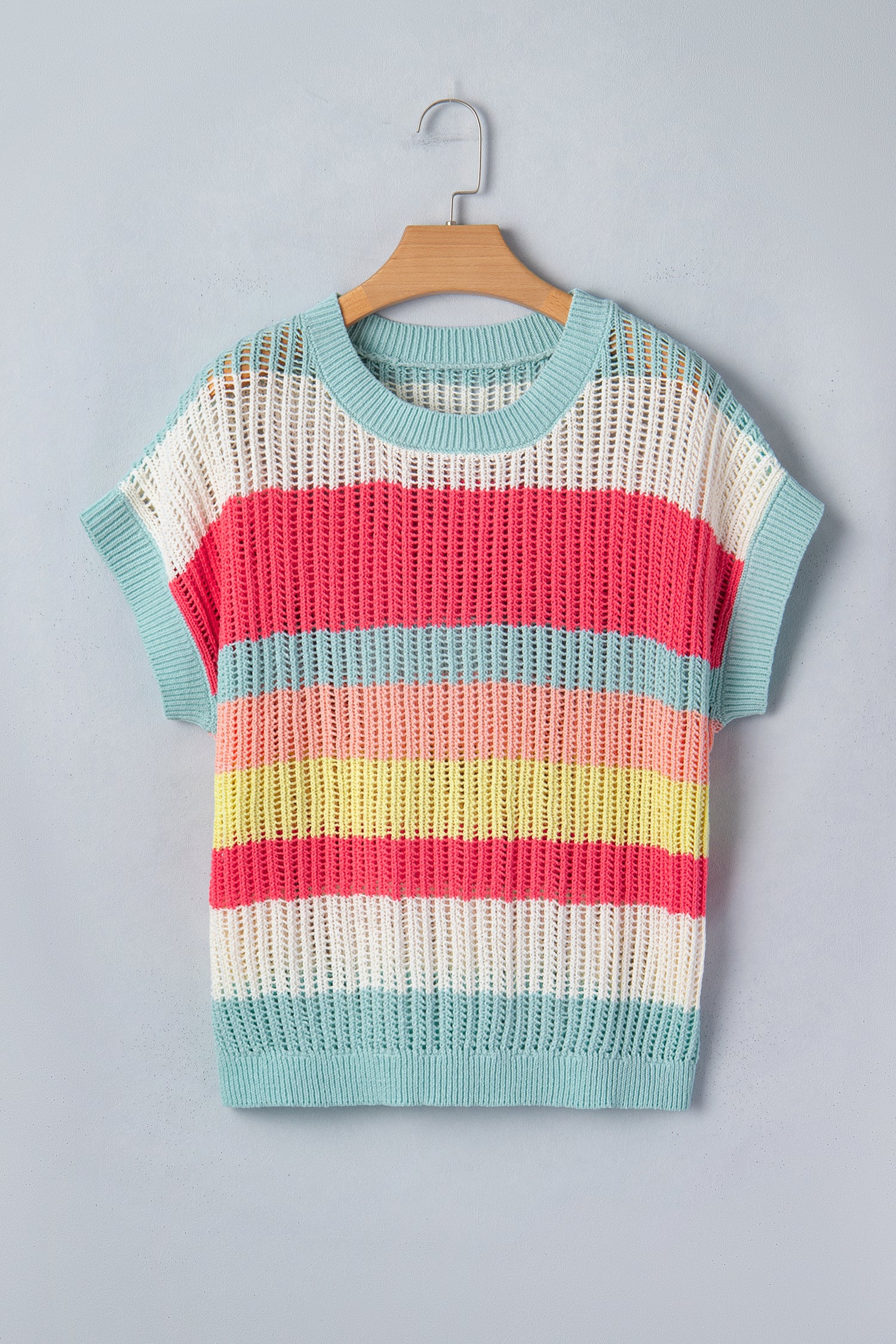Green Stripe Color Block Hollow Out Knit Short Sleeve Sweater